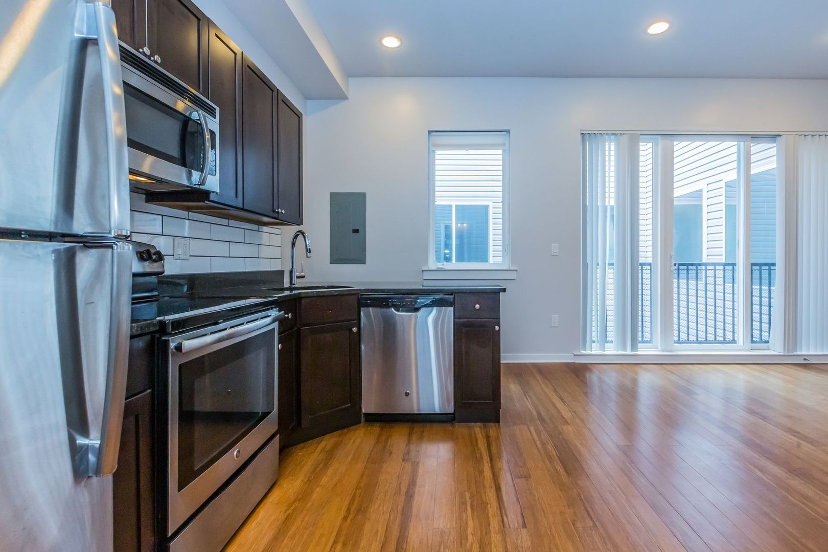 • Contemporary kitchen with stainless steel appliances and granite countertops