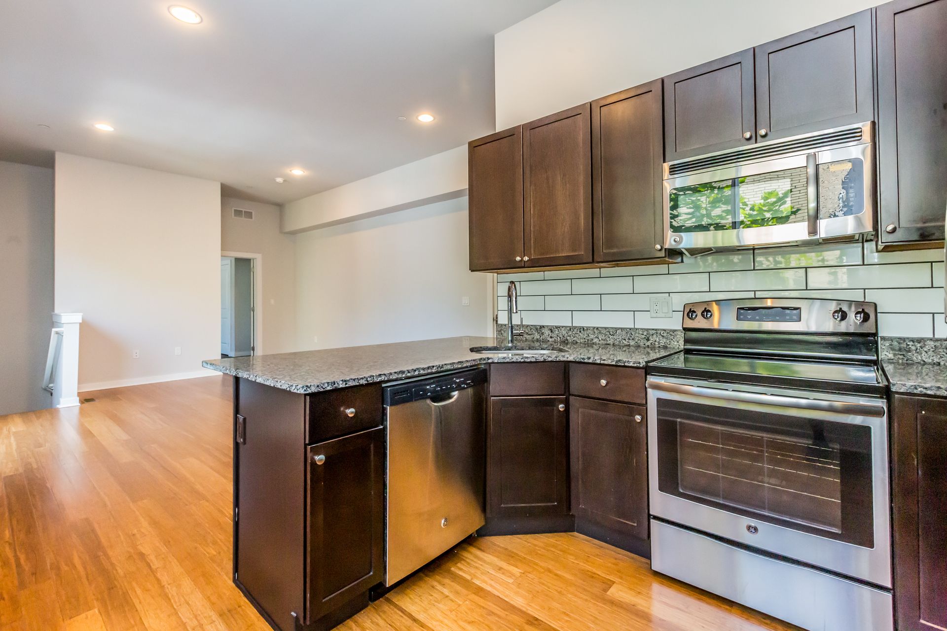 • Contemporary kitchen with stainless steel appliances and granite countertops